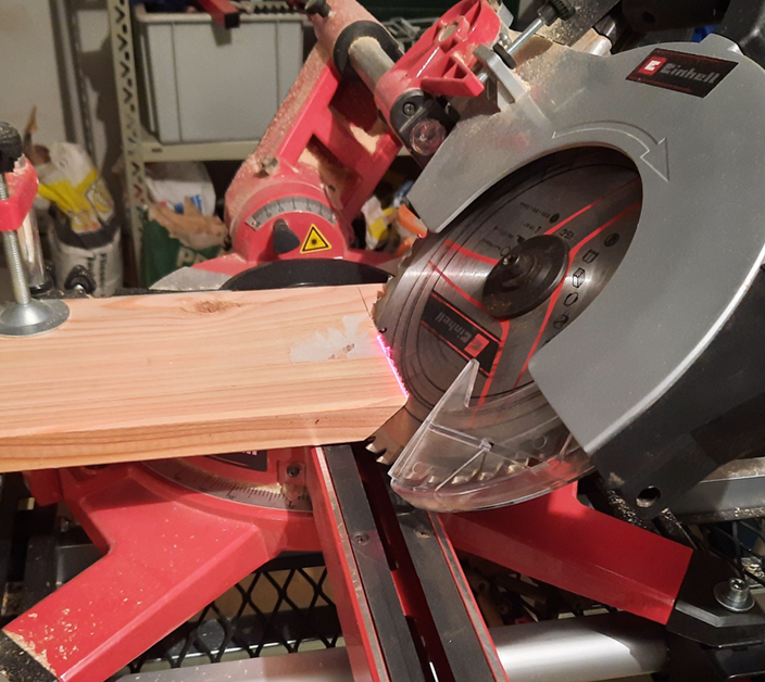 Schließlich passt man die zukünftigen Seitenwände an. Auch hier wird im Winkel geschnitten, allerdings nimmt man wieder die 24 cm breiten Bretter. In diesem Fall soll die längere Seite eine Länge von 53 cm haben. Auch hier reicht ein Schnitt im Winkel. Abschließend stellt man die Säge zurück in Ausgangsposition und kürzt die abgeschrägten Bretter auf die richtige Länge.