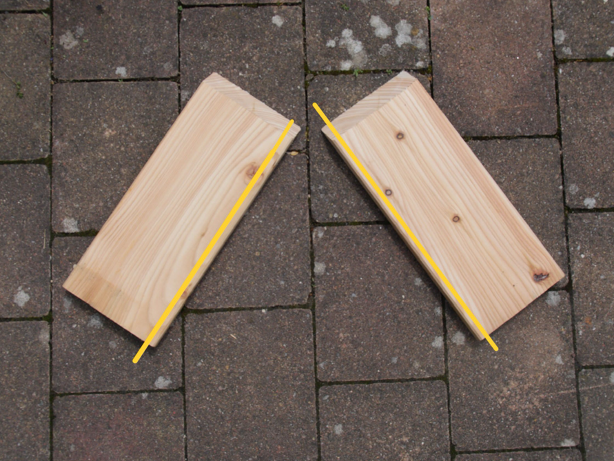 Als Nächstes sägt man angewinkelt die 28 cm breiten Bretter zurecht. Die längere Seite soll eine Länge von 35 cm haben. Nach ihr ist das Brett auszurichten. Ein Schnitt im Winkel reicht für beide Dachbretter. Man legt beide Bretter zur Seite.
