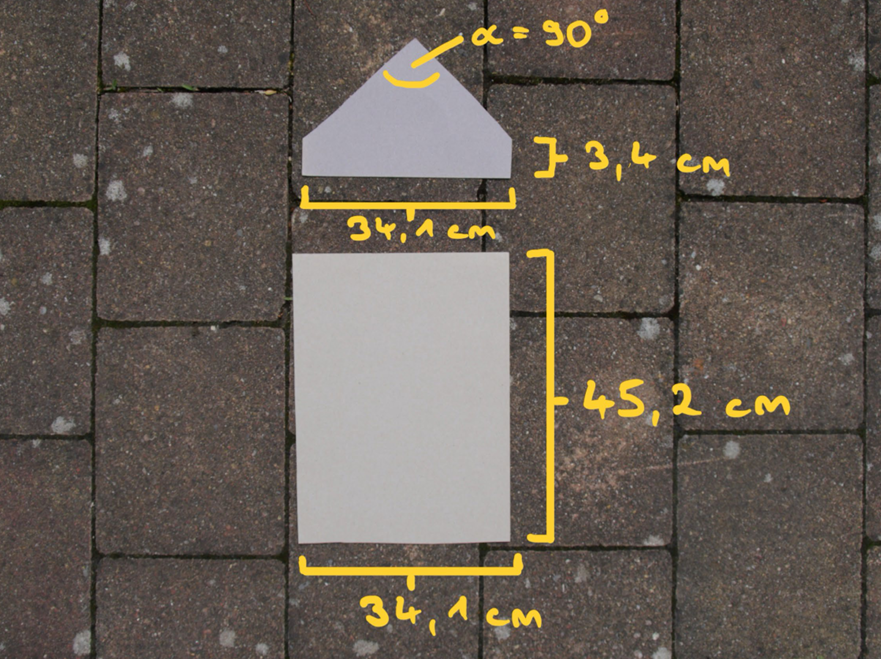 Man nimmt die Schrankrückwand und das Zeichenmaterial zur Hand. Auf die Rückwand zeichnet man ein Rechteck (34,1*45,2) auf. Mit ausreichend Platz nach oben zeichnet man ein weiteres Rechteck (34,1*3,4) und konstruiert dann zwei Halbgeraden im Winkel von 45 Grad von den Eckpunkten des kleinen Rechtecks. Der Schnittpunkt ist die Spitze des Giebels. Schließlich werden beide Formen mit der Stichsäge ausgeschnitten.