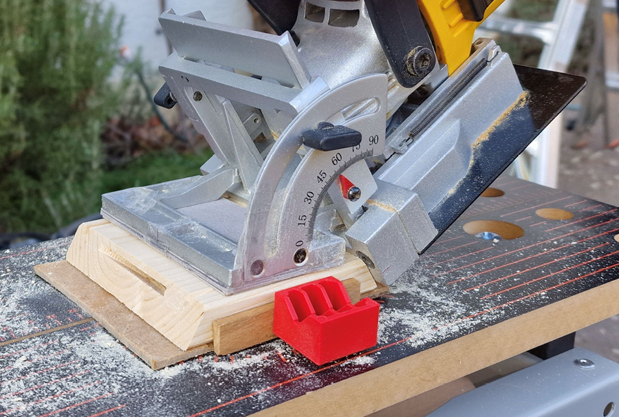 Für die folgenden Schritte ist die Kreissäge grundsätzlich in einer Neigung von 45 Grad zu verwenden.