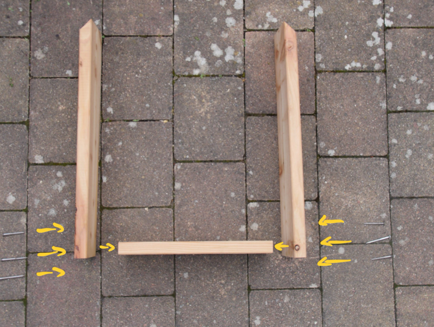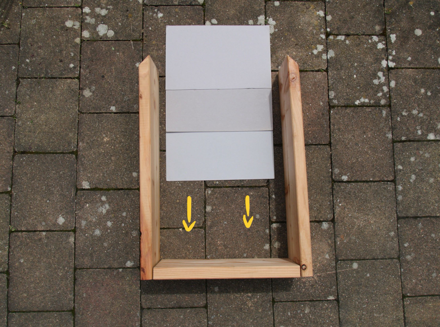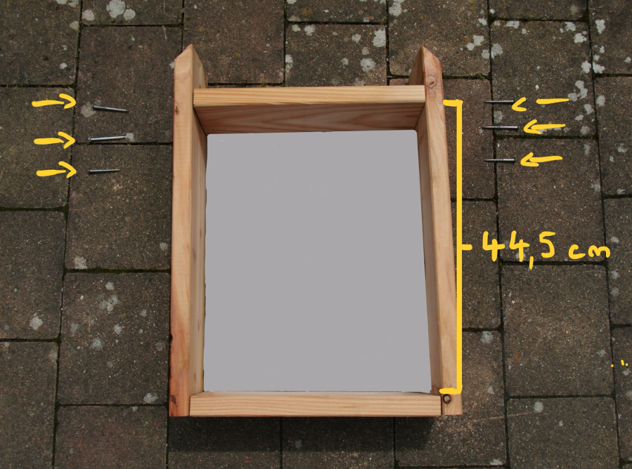 Das 33,5 cm lange Brett mit einer Nut wird so mit den beiden 53 cm langen Brettern verschraubt, dass alle Nuten nach innen zeigen. Hierfür verwendet man drei Schrauben.