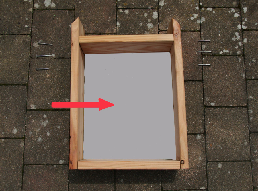 Das zuvor in der Breite veränderte Brett wird zwischen die beiden Außenbretter eingefügt. Es soll den Innenraum mittig trennen. Es soll nach vorne hin bündig mit den anderen Brettern abschließen. Um es zu befestigen braucht man nur 2 Schrauben pro Seite.