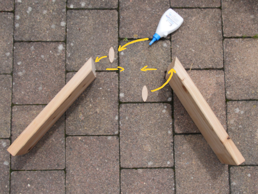 Über die Einkerbungen auf der schrägen Seite, zwei Tischverbinder und Holzleim werden die breiteren Bretter verbunden. Es ergibt sich ein Winkel von 90 Grad. Dieses Gebilde sollte KURZ aushärten, aber im Idealfall nicht vollständig.