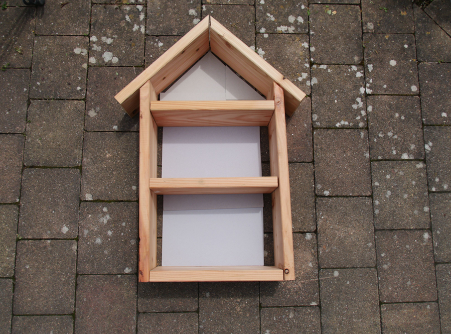 Die dreieckige Rückwand wird in die obere Nut gesetzt und das Dach aus dem vorherigen Schritt aufgesetzt.