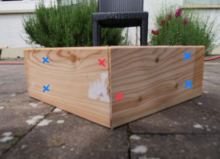 Schließlich wird das Dach mit dem Rest verschraubt. Die blauen Kreuze in der Abbildung markieren Schrauben, die aus der Vogelperspektive senkrecht nach unten in die Seitenwände gebohrt werden. Die roten Kreuze stellen Schrauben dar, die orthogonal zum Brett durch das eine in das andere Brett gebohrt werden müssen.