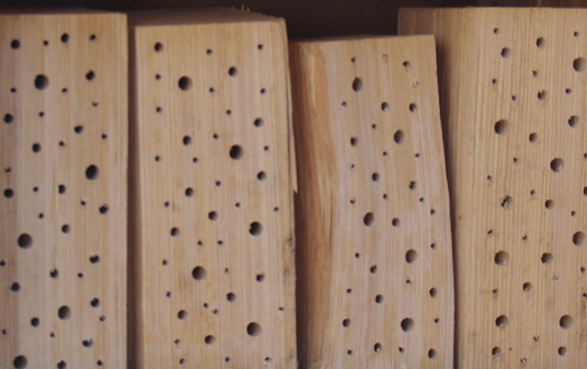 Man kann die Nisthilfe mit sämtlichem Material füllen, das als Nistplatz geeignet ist. Besonders zu empfehlen sind Strangfalzziegel und Hartholzblöcke, in die man unterschiedlich große Löcher (6-9mm) gebohrt hat.