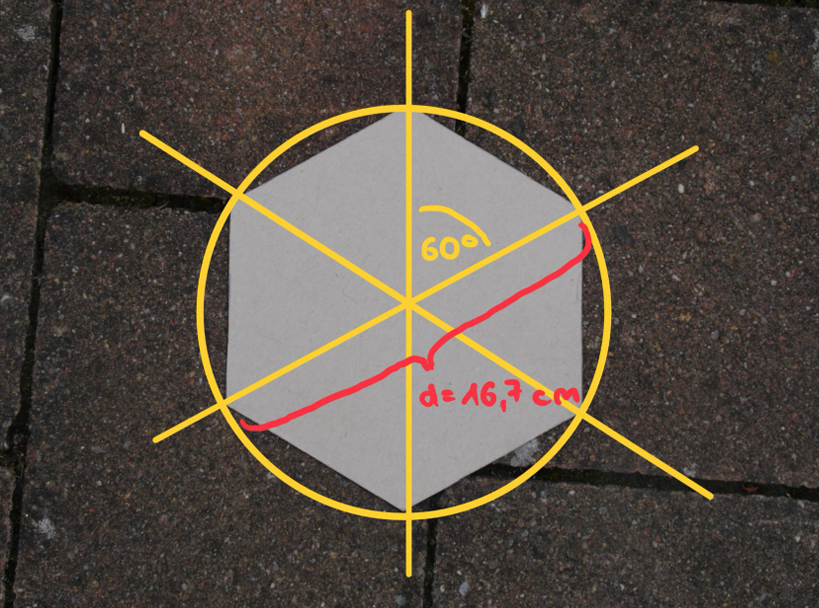 Man zeichnet auf der Schrankrückwand einen Kreis mit dem Durchmesser 16,7 cm. Dann zeichnet man durch den Mittelpunkt eine Linie an. In beide Richtungen wird eine weitere Linie im Winkel von 60 Grad gezeichnet. Wenn man nun die Schnittpunkte mit dem Kreis miteinander verbindet, erhält man das Sechseck und kann es mit der Stichsäge ausschneiden.