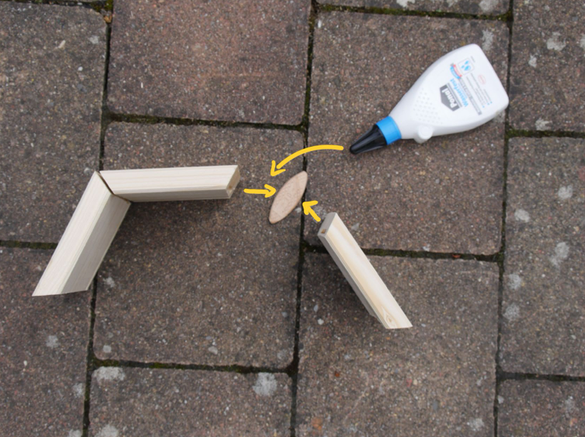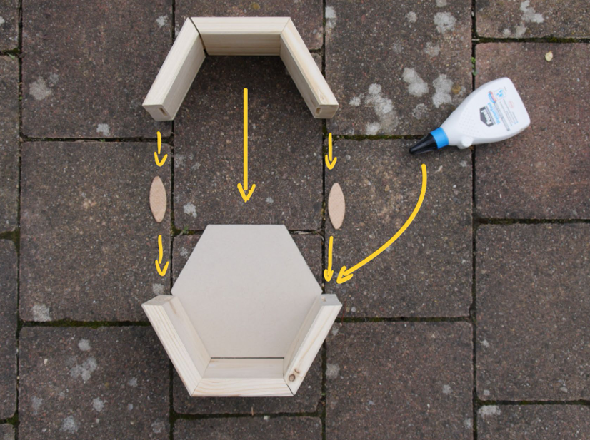 Hierfür nimmt man zunächst die 12 cm und 14 cm breiten Bretter getrennt zur Hand. Nun werden die jeweils gleich breiten Bretter mithilfe von Tischverbindern und Holzleim zusammengefügt. Dabei entstehen zwei halbe Sechsecke.