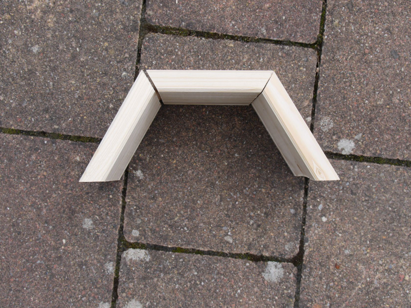 Je nach persönlicher Vorliebe nimmt man entweder Bitumenschindeln, Dachpappe oder Kupferklebestreifen und befestigt sie auf den 14 cm langen Brettern.